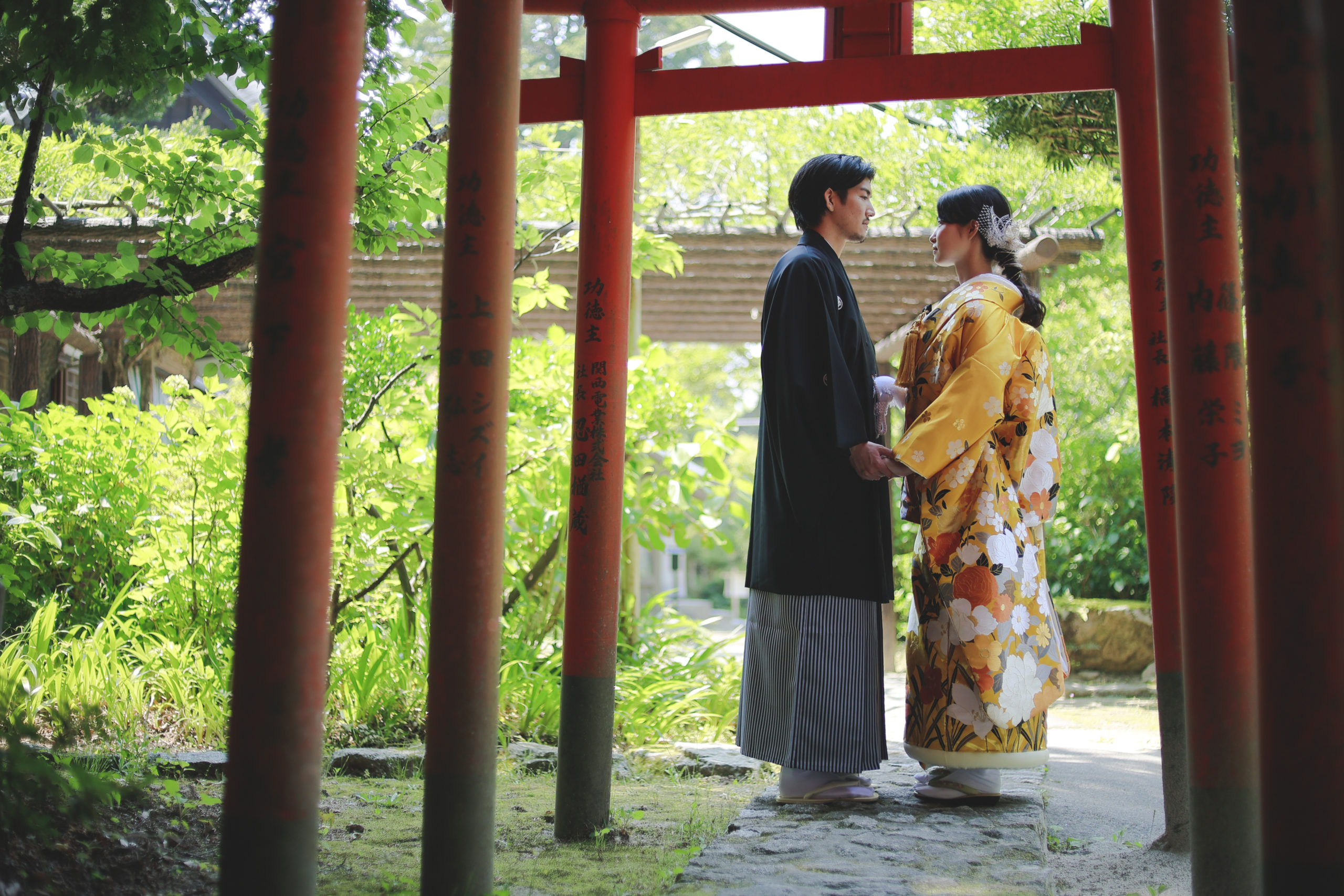 赤い鳥居と色づいた緑の色合いが綺麗で