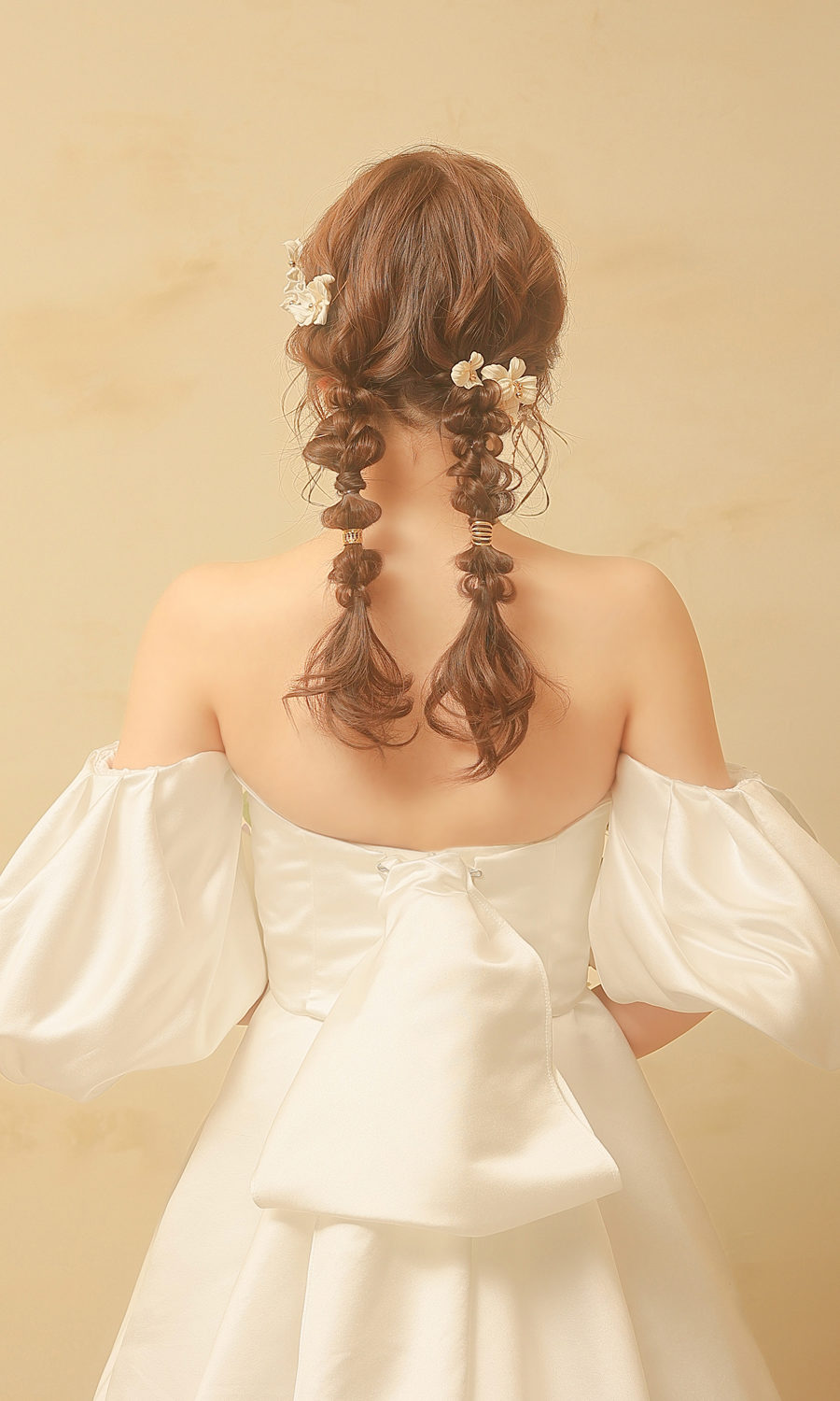高めのシニヨンに毛先を遊ばせて