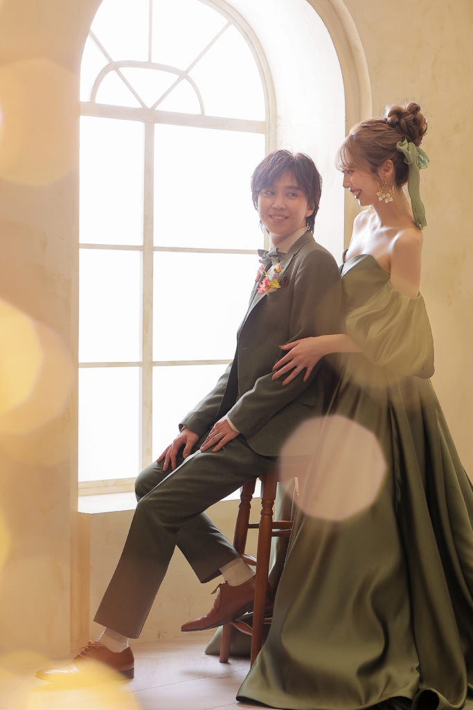 同色のカーキタキシードを合わせた